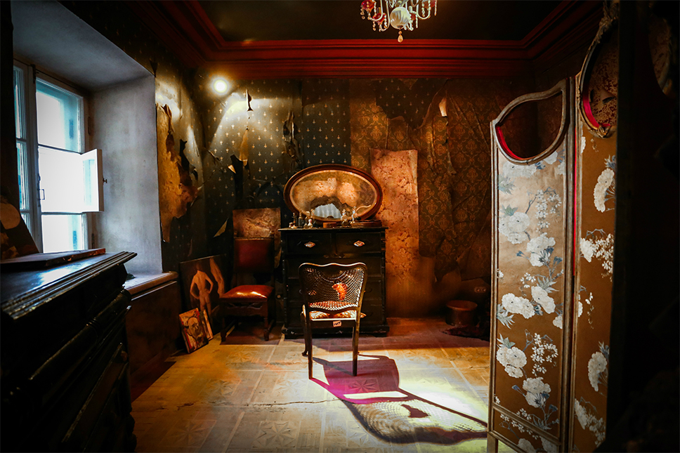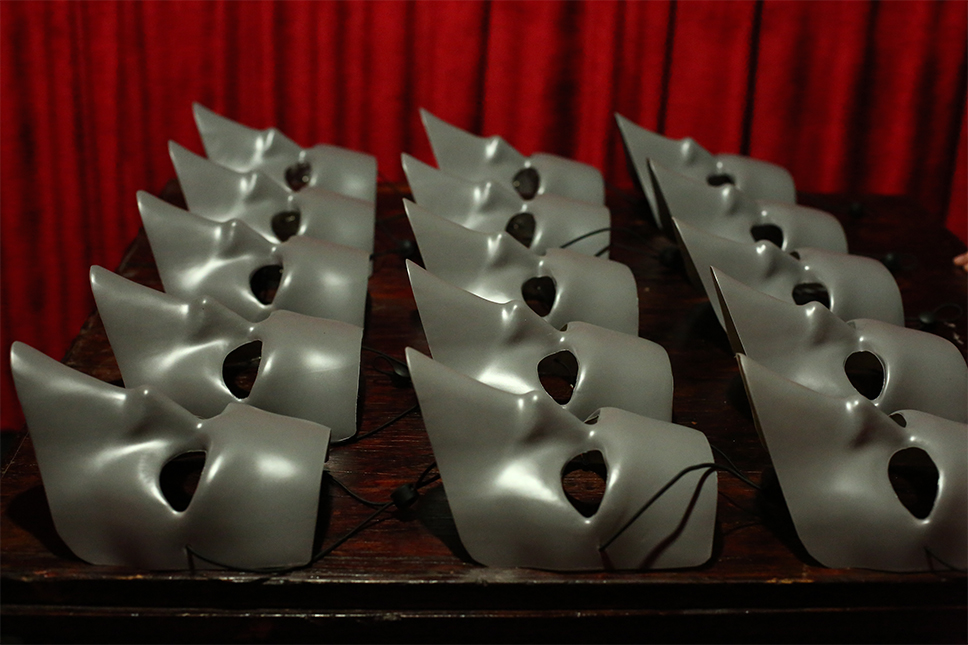 В подвальном этаже особняка уместили тайный спикизи-бар, в который, по замыслу, зритель может спуститься в любой момент, решив сделать перерыв в своем проживании пьесы Ибсена. Здесь же, за портьерой, дают финальные инструкции: не снимать маску, не разговаривать, не ходить парами, а разделиться (последнее правило, кстати, успешно нарушается чуть ли не каждым, пришедшим сюда не в одиночестве, а в компании). Первый, второй и третий этажи целиком и полностью отданы под сценическое пространство. Первый — этаж прислуги, второй — хозяев дома, на третьем же найдутся и пасторский приход, и сиротский приют — тот самый, что в самом начале «Привидений» планирует открывать фру Алвинг. Потайных комнат, лабиринтов и других довольно примечательных помещений здесь обнаружится достаточно, и рассказать о них было бы ошибкой, лишающей каждого нового зрителя чувства первопроходца. Главное — напомнить о том, что у всего в этом доме есть двойное дно, а добираться до него или нет — уже личное дело каждого.