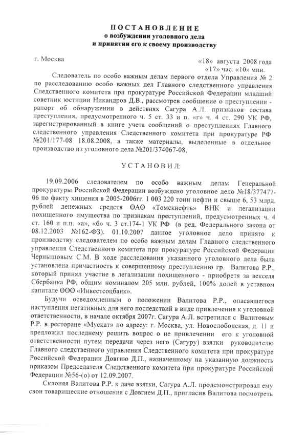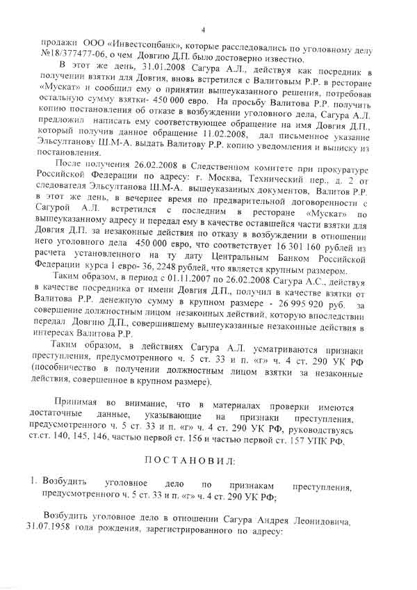 В распоряжении Ъ оказался текст постановления о возбуждении уголовного дела в отношении Андрея Сагуры, подозреваемого в получении взятки совместно с Дитрием Довгием.