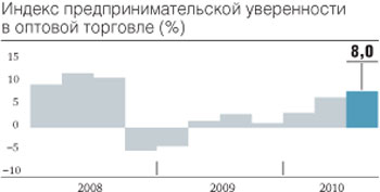 8 процентов составило в третьем квартале 2010 года значение индекса предпринимательской уверенности в оптовой торговле, рассчитываемого Центром конъюнктурных исследований (ЦКИ) ГУ ВШЭ. Индекс рассчитывается ЦКИ на основе анализа деятельности 2,6 тыс. оптовых компаний, проводимого Росстатом. По сравнению со вторым кварталом 2010 года он прибавил 2 процентных пункта. По мнению экспертов, помимо традиционно благоприятного периода для оптовиков рост индекса в третьем квартале обеспечили "негативные климатические условия" — жара и смог позволили оптовикам повышать цены на товары, об этом заявили 60% респондентов. Доля предпринимателей, отмечавшая увеличение спроса на бытовые товары, выросла по сравнению со вторым кварталом в два раза — до 34%. "Однако "сберегательный лад", на который настроены многие домохозяйства, и высокие инфляционные ожидания респондентов могут отрицательно сказаться на деятельности оптовых фирм в конце 2010 года",— отмечает директор ЦКИ Георгий Остапкович.