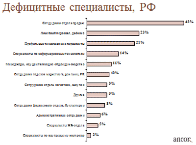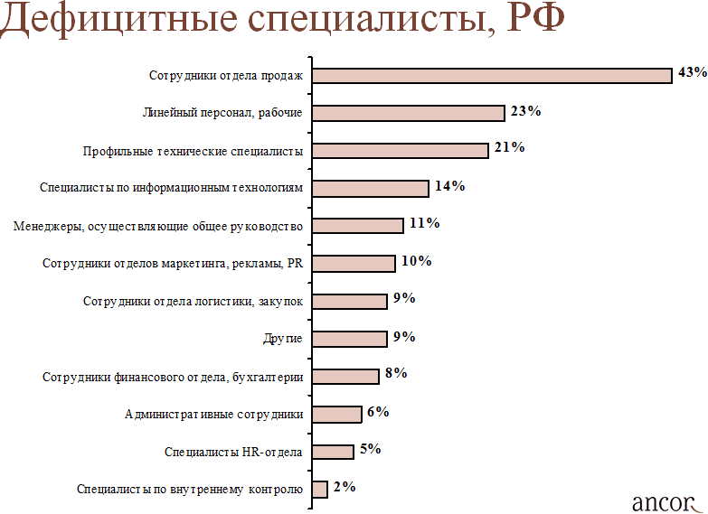 Как выяснили аналитики кадрового холдинга АНКОР, компании при подборе персонала за последние два года испытывали самые большие сложности, когда им необходимо было найти сотрудников отдела продаж — на них как дефицитных специалистов указали 43% компаний. Дефицит рабочих и линейного персонала — в основном это слесари, электромонтеры и продавцы-консультанты — отметили 23% компаний. Еще 21% назвали проблемой дефицит профильных технических специалистов — преимущественно инженеров на производстве и в строительстве. В список ценных работников попали также специалисты по информтехнологиям — программисты и разработчики, сотрудники отделов маркетинга и PR (маркетологи и бренд-менеджеры), специалисты по закупкам и логистике, а также менеджеры, осуществляющие общее руководство.