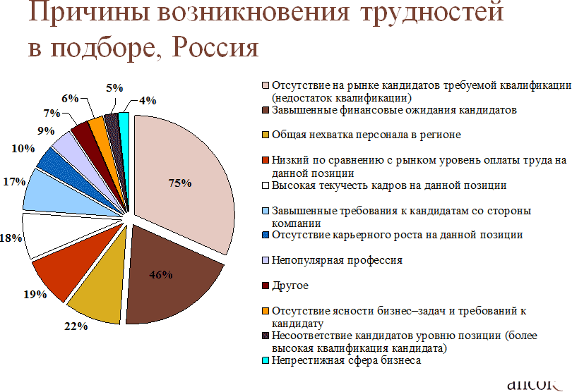 С выводами АНКОРа соглашаются в рекрутинговой компании «Агентство Контакт» — там, впрочем, считают, что рынок уже на 90% является рынком кандидата. «Соискатели получают на руки несколько предложений и имеют возможность выбирать. Размер заработных плат приблизился к докризисному уровню, что позволяет кандидатам рассчитывать на более интересные условия оплаты труда»,— отмечает партнер «Агентства Контакт» Галина Спасенова. Основными причинами, из-за которых ситуация с подбором профессиональных кадров в России ухудшается, по мнению компаний, являются отсутствие на рынке кандидатов требуемой квалификации (указало 75% опрошенных), а также завышенные финансовые ожидания кандидатов (46%), что особенно характерно для молодых специалистов. По оценке MarksMan, в настоящее время кандидаты завышают зарплатные ожидания в среднем на 20–30%. Впрочем, там отмечают, что значительное завышение финансовых ожиданий кандидатов является характерной чертой быстрорастущего российского рынка. Также среди причин возникновения трудностей при подборе персонала отмечаются низкий уровень оплаты труда и высокая текучесть кадров, завышенные требования компаний к кандидатам. При этом опрос показал, что HR-специалисты настроены более чем пессимистично: три четверти опрошенных указали, что ситуация с квалифицированными кадрами не улучшится.
