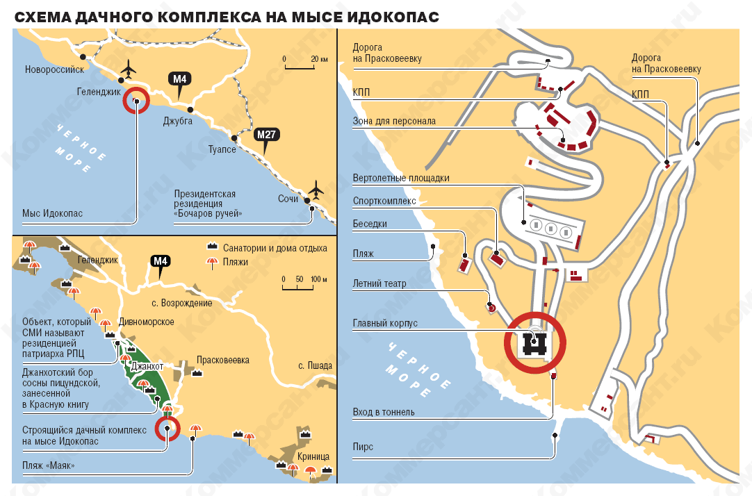 О покупке "Ъ" рассказал сам господин Пономаренко: его структура приобрела две компании — ООО "Лазурная ягода" и ООО "Идокопас", владеющие недостроенным гостиничным комплексом на мысе Идокопас в Геленджикском районе Краснодарского края (см. блицинтервью). По его данным, "Идокопас" владеет около 67 га земель рекреационного назначения в селе Прасковеевка (см. рисунок): на участке ведется строительство пансионата из нескольких сооружений общей площадью примерно 26 тыс. кв. м. В собственности "Лазурной ягоды" — еще приблизительно 60 га земель сельскохозяйственного назначения в районе села Дивноморское (находится в 13 км от Прасковеевки), из которых примерно 27 га используются под виноградники, 33 га не освоены. Кроме того, "Лазурная ягода" арендует земельные участки рекреационного назначения общей площадью приблизительно 160 га, на которых расположены временные некапитальные сооружения — забор, автодорога и др. На территории этих участков планируется строительство нескольких туристических объектов — шато, винодельни.