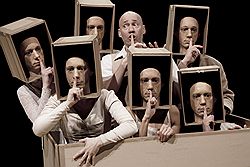 Впрочем, главные изменения в настроении спектакля произошли не на злобу дня. "Неподвижные пассажиры" — поэтическое назидание Жанти о тщете человеческих усилий и о бесцельности ежедневной гонки за успехом. Эмоциональной кульминацией спектакля раньше была сцена, в которой актеры словно бежали за управляемой ими куклой, которая сначала вылуплялась из кокона, потом облачалась в рыцарские доспехи, потом — в деловой костюм. Человек несся неизвестно куда, подминая себе подобных и не разбирая дороги, чтобы в конце концов остаться бестелесным ничем, своего рода призраком или воздушным змеем — головой, закрепленной на обрывках бумаги.