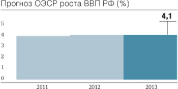 4,1% ВВП составит, по прогнозу Организации экономического сотрудничества и развития (ОЭСР), рост экономики РФ в 2012-2013 годах. Данные ОЭСР отражают снижение организацией прогнозов роста российской экономики в 2011 и 2012 году. Так, ВВП России в 2011 году увеличится на 4%, свидетельствует презентация ОЭСР к докладу о перспективах мировой экономики Economic Outlook. В майском докладе ОЭСР ожидала роста на уровне 4,9%. Прогноз роста экономики на 2012 год также снижен — до 4,1% с 4,5%, ожидавшихся в мае. Впрочем, прогноз организации отражает стабилизацию экономики РФ, особенно на фоне ЕС, долговой кризис в котором ОЭСР называет важнейшей угрозой для мирового развития. Среди стран БРИКС (Бразилия, Россия, Индия, Китай и ЮАР) РФ по темпам роста экономики обгонит только две — Южную Африку и Бразилию. Китай остается в лидерах, обгоняя Индию на 1-2 процентных пункта. При этом растущий тренд, по ожиданиям ОЭСР, в течение 2011-2013 годов будет наблюдаться только в экономике ЮАР.