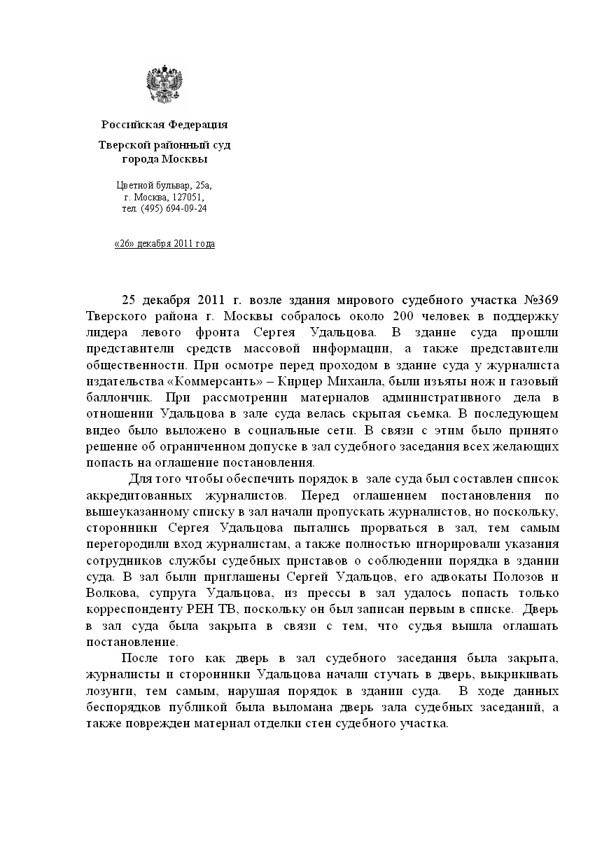 Вокруг очередного заключения под стражу координатора «Левого фронта» Сергея Удальцова, которого суд арестовал на десять дней за сопротивление полицейским после отбытия 15-суточного ареста, разгорелся скандал. Представители Общественной палаты РФ направили в Мосгорсуд и Федеральную службу судебных приставов обращение с просьбой объяснить, почему на оглашение решения в отношении оппозиционера не были допущены журналисты. О готовности проводить пикеты с требованием освободить Сергея Удальцова заявили правозащитники и блогеры. В службе судебных приставов заявили, что действовали по закону, а в «Единой России» призвали уважать решение суда.