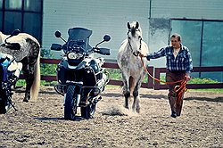 А еще, и лошадей, и мотоциклы делают на заводах. Правда, в случае с парнокопытными они еще называются "племенными репродукторами", так как в их задачу входит не только разведение, но и улучшение определенной породы. Когда-то в России вывели породы лошадей, прославившие нашу страну во всем мире, например, рысистую орловскую или владимирского тяжеловоза, а при советской власти мы даже производили мотоциклы, за которые было не стыдно на мировом рынке. Поскольку мотопром у нас нынче уже не тот, а лошадей у нас все еще разводят, то для поездки по российским конным заводам мы выбрали железных коней марки BMW.