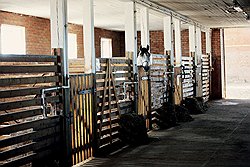 Конный завод роднит с мотоциклетным разве что только название. Вместо конвейера - конюшни с денниками, так называются индивидуальные для каждой лошади секции. Не стоит путать денник со стойлом, в котором лошади стоят в ряд, отделенные друг от друга боковыми перегородками. Назначение остальных помещений можно понять по их названиям: фуражная, инвентарная, сбруйная, шорная... Кобылы и жеребцы содержатся в отдельных денниках. Первым полагается по 12 квадратных метров денника и ежедневный прогон на расстояние в несколько километров переменным аллюром, а ценным жеребцам-производителям - не менее 20 квадратов и только лишь часовой моцион в виде проездки под седлом. Для моциона племенных лошадей вблизи конюшен устраивают выгульные дворики - паддоки или левады, огороженные прочной оградой. Разделение понятий левада и паддок достаточно условно - практически, это одно и то же, а именно - искусственное или естественное пастбище для летнего содержания и выпаса лошадей. Кстати, паддок есть и в мотоспорте - так именуют специальное место, служащее для развертывания моторхоумов команд и пребывания высокопоставленных личностей, у которых свой "моцион".