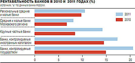 С другой стороны, банковский сектор традиционно характеризуется высокой концентрацией и несбалансированностью в распределении прибыли между разными группами банков. Скорее всего, в 2012 году продолжится тенденция усиления неравенства между различными группами банков. В 2011 году неравенство в распределении прибыли только усилилось — прежде всего за счет смещения акцента в сторону банков, контролируемых государством. Если в 2010 году рентабельность капитала для этой группы составила 14,8%, то в 2011 году этот показатель вырос до 20,6% (прежде всего, конечно, за счет рекордной прибыли уже упомянутого Сбербанка).