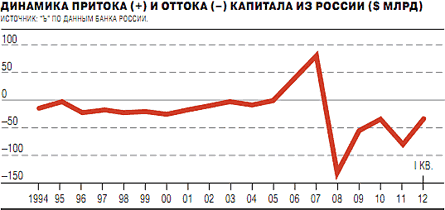 Еще один фактор торможения банковской системы, который принято частично связывать с президентскими выборами,— отток капитала из страны. В 2011 году отток достиг $84,2 млрд, превысив показатель "кризисного" 2009 года. Первый квартал 2012 года не принес ожидаемой коррекции: из России было выведено еще $42 млрд. Масштабы квартального оттока капитала были настолько высоки, что даже высшему руководству ЦБ, всегда настроенному оптимистично, пришлось признать, что по итогам 2012 года сальдо также будет отрицательным.