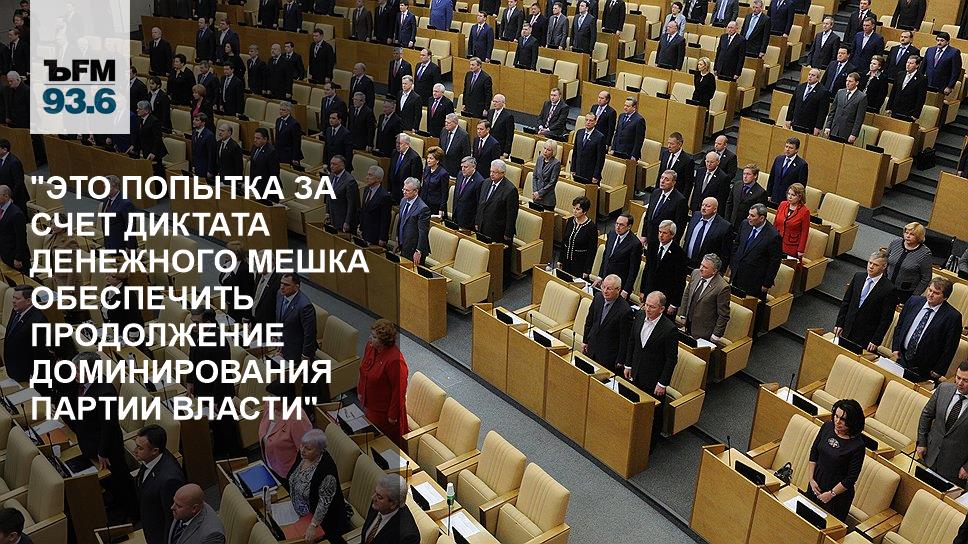 Ведь, обратите внимание, первое, что сделано в данном законопроекте –– резкое увеличение объемов избирательных фондов. То есть просто классика жанра, в том числе в марксистском понимании, диктат денежного мешка. У кого больше денег, тот и победил.