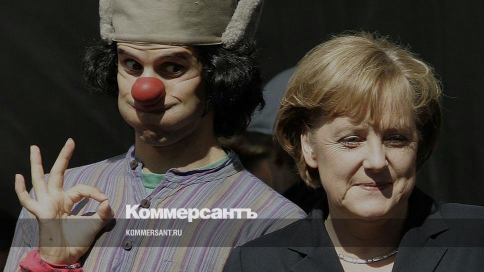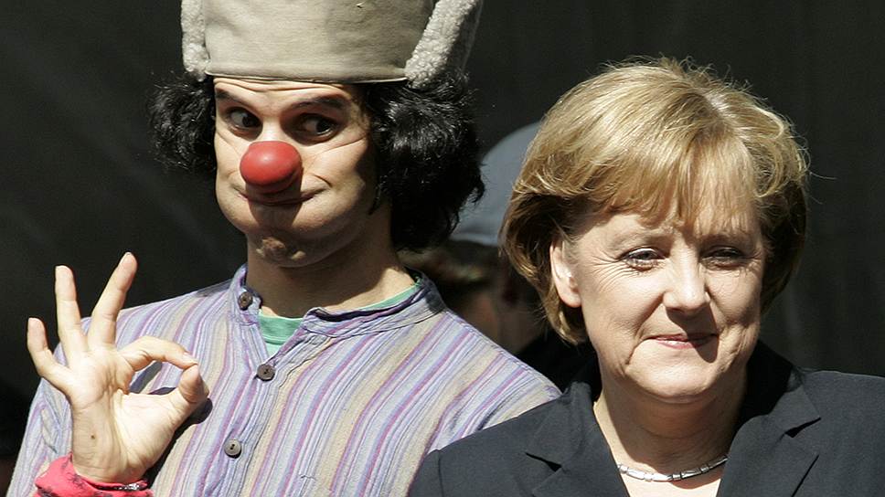 Молодой клоун выступает рядом с канцлером Германии Ангелой Меркель