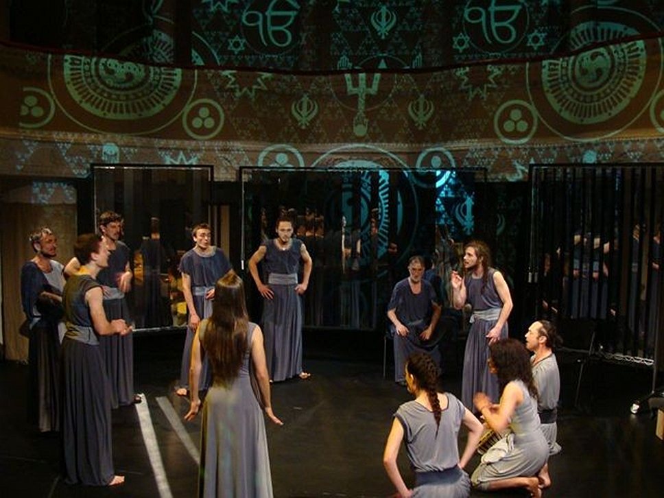 В общем-то, здесь, на имитации диалога сцены и зала, по сути, и оканчивается сюжет спектакля. Зрители, вопреки зыбким надеждам авторов, к дискуссии не подключаются, а попросту начинают наслаждаться различными пластическими и вокальными виньетками, которыми в духе излюбленного курбасовцами украинского барокко щедро украшено повествование — духовными песнопениями, ритуальными кружениями, хореографическими этюдами, демонстрирующими прилежное посещение актерами различных тренингов, но вряд ли способствующими обнаружению каких-либо дополнительных смыслов. Вавилонское столпотворение транслируемых культурных знаков лишь усиливает ощущение декоративного излишества: актеры облачены в одинаковые туники, при этом мужчины в толпе носят головные уборы, стилизованные под папскую тиару, квадратную шляпу китайского монаха, конусообразные короны фараонов и месопотамских царей, а в видеопроекциях с монотонной периодичностью возникают символы разных культур и религий. В этом контурно воссозданном храме нашей цивилизации, по замыслу авторов, разумеется, есть место лишь сверхчеловеку, динамично развивающемуся духовно, творчески и интеллектуально. О профанации этой светлой идеи во времена Третьего рейха постановщики тоже не забыли упомянуть в одной из интерлюдий — впрочем, и тут дальше констатации дело не пошло.