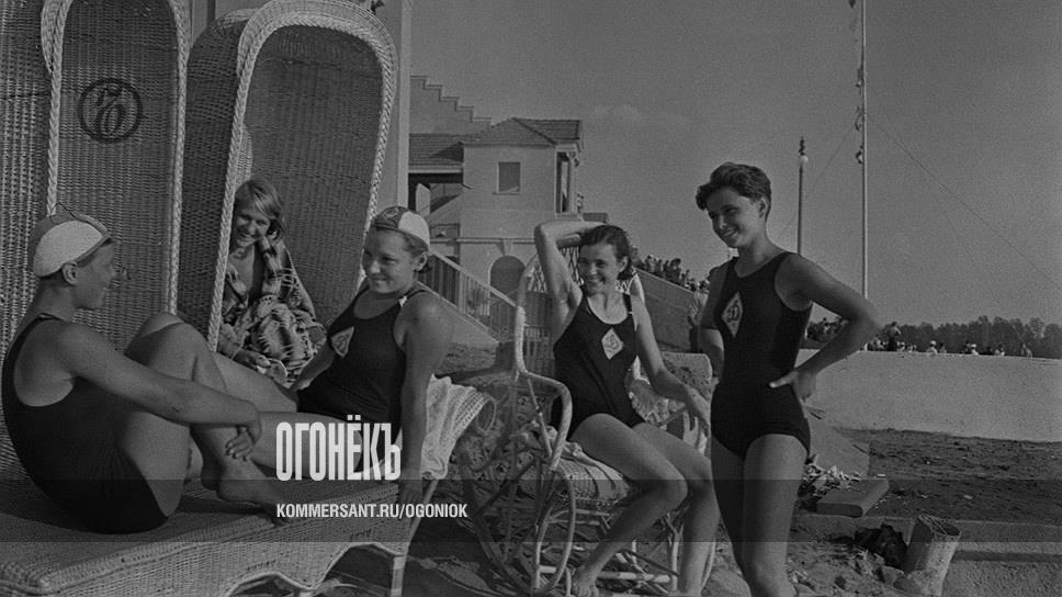 Пляж на Химкинском водохранилище, 1930-е годы. Девушки в купальниках с эмблемой общества "Динамо" на фоне водного стадиона "Динамо". Мода на спорт на глазах становится массовой, а сам спорт — общедоступным