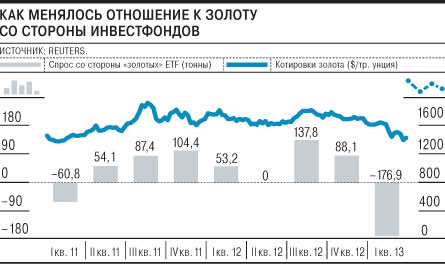 Одновременно на рынке сложилась уникальная ситуация — на фоне растущего спроса на монеты, слитки и медали биржевые фонды ETF, инвестиционные декларации которых ориентированы на вложение в золото, впервые с первого квартала 2011 года активно его продавали. За отчетный период они сократили свои активы почти на 177 тонн — максимальный объем за все время наблюдения. Данные крупнейшего в мире биржевого "золотого" фонда SPDR Gold Trust свидетельствуют о том, что тенденция начала года сохранилась. С начала апреля объем активов под управлением фонда снизился почти на 183 тонн, до 1034 тонн — минимального значения за четыре года.