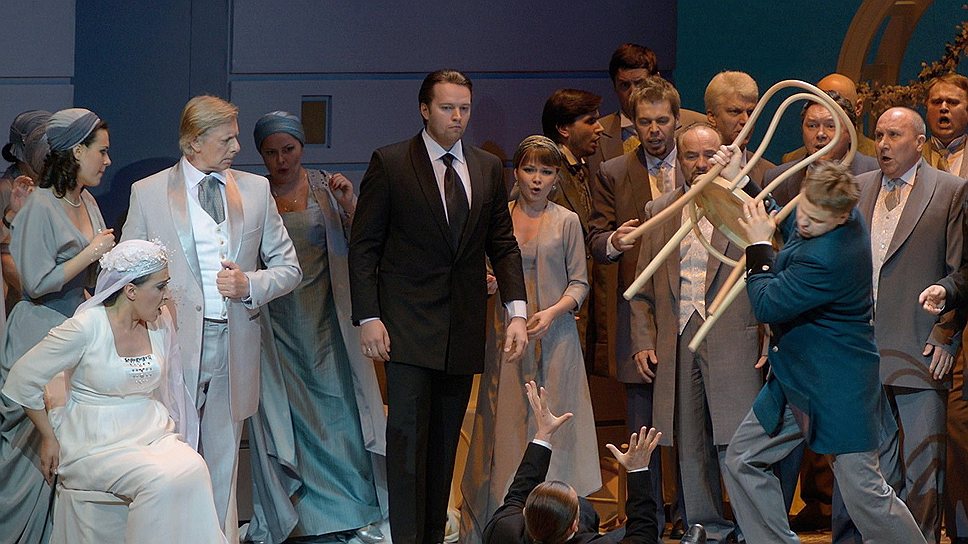 В третьем акте сцена делится на две симметричные комнаты аристократического дворца, в каждой — по отдельной кровати и по сервированному на одну персону столу: снедаемые одиночеством, чужие друг другу молодожены и спят, и обедают порознь. Здесь раздавленного жизнью героя настигает отец утопленницы, из романтического безумца превращенный режиссером в расчетливого мстителя. Развязка оперы Даргомыжского происходит на берегу Днепра, развязка спектакля Василия Бархатова — в выстроенном на мариинских подмостках театре, где не выдерживающего просмотра оперы из морской жизни (Мария Данилова не без заметного удовольствия цитирует тут столетней давности костюмы Михаила Врубеля к первой постановке "Садко" Николая Римского-Корсакова) героя настигает сердечный приступ: пока на одной половине сцены его безмолвно пытаются возвратить к жизни, на другой он, пребывая в коме, напоследок выясняет отношения со всеми, кто его любил и кто от него пострадал. Готовящийся вот-вот разменять четвертый десяток Василий Бархатов вырастает в по-настоящему большого режиссера: лучшие эпизоды "Русалки" стоят многих спектаклей большинства его российских коллег. Господин Бархатов не просто реабилитировал пылившуюся в запасниках партитуру, которую вплоть до мариинской премьеры крайне трудно было представить в современном театральном контексте,— на пару с Зиновием Марголиным ему удалось выявить драматический потенциал музыки Александра Даргомыжского, заставив прозвучать "Русалку" так, как она не звучала еще ни разу за всю свою полуторавековую сценическую историю.