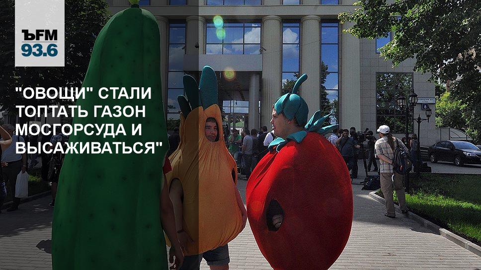 — Да, потом после "огурца" пришел огромный "помидор". У него был уже немного другой плакат. Было написано "Посадить! ОМОНовцы тоже люди". И третьим появился огромный "лук". Когда в пикет во дворе суда встал Илья Яшин, который тоже требовал освобождения фигурантов дела, эта троица овощей вошла внутрь территории суда и стала прогуливаться, подходила к Яшину, видимо, пытаясь его как-то спровоцировать. Но оппозиционер никак не реагировал. Потом овощи стали топтать, в буквально смысле, газон Мосгорсуда и высаживаться — изображать из себя те посадки, которых они так рьяно требовали на своих плакатах.