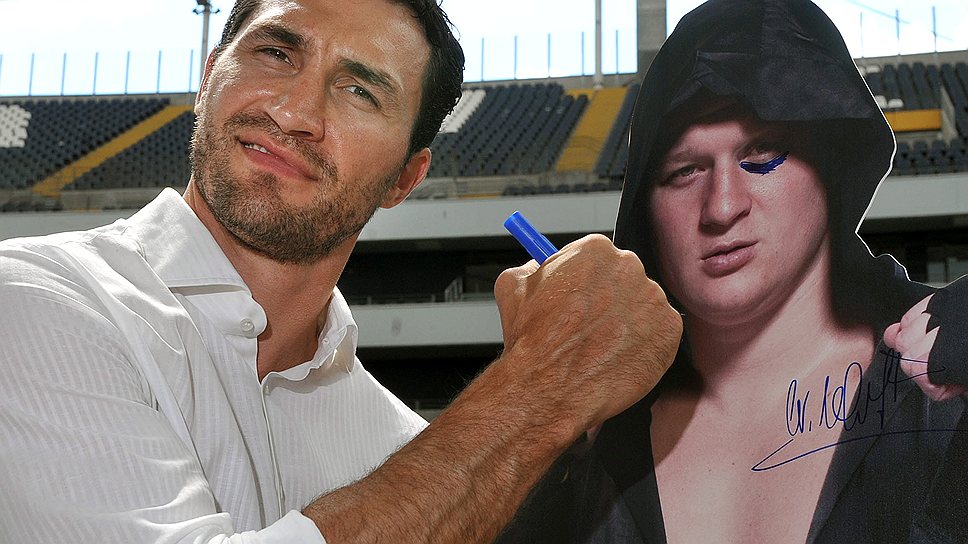 Владимир Кличко (слева) и картонная фигура Александра Поветкина