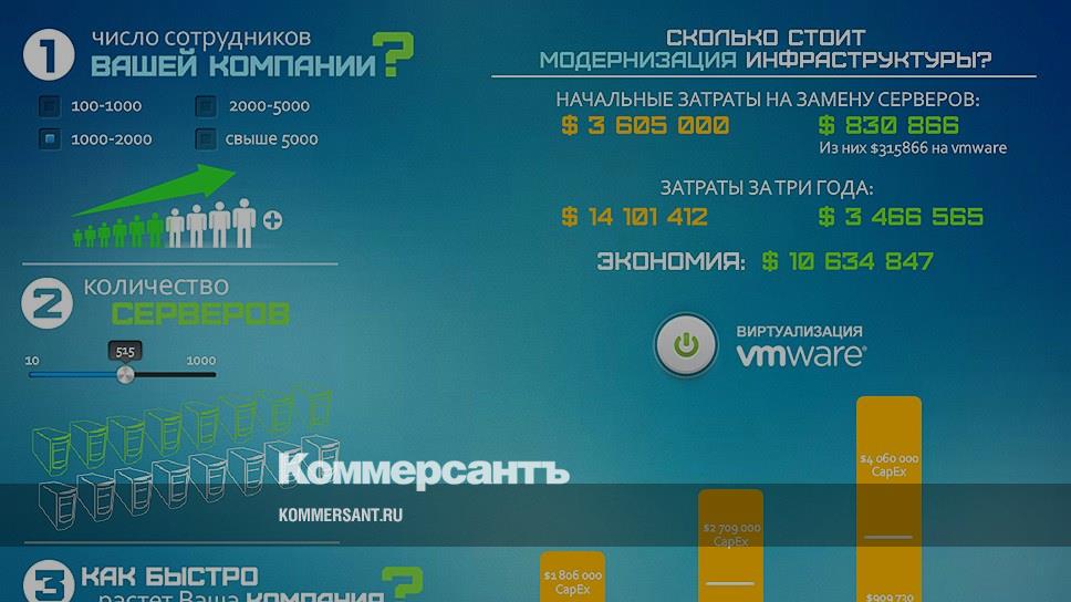 Виртуализация позволяет экономить — это уже не новость. Вопросом остается, какую сумму удастся сберечь и сколько нужно потратить на виртуализацию изначально? Интерактивная инфографика, созданная редакцией iOne в партнерстве с компанией VMware, помогает довольно точно рассчитать начальные затраты и сумму экономии на ближайшие три года.