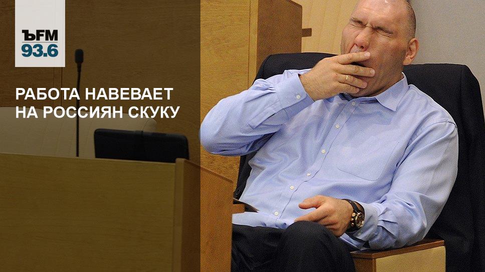 Россиянам стало скучно работать. Только 24% респондентов портала Работа@Mail.ru заявили, что всегда увлечены своим делом. Тогда как большинство — почти 60% — испытывают скуку на рабочем месте. При этом 15% респондентов заявили, что это происходит регулярно. Опрос проводился во всех федеральных округах России, в нем приняли участие почти 1,2 тыс. человек. Бизнес-тренер, генеральный директор компании "Камов-Класс" Сергей Камов считает, что руководители компаний недостаточно мотивируют своих сотрудников на работу.