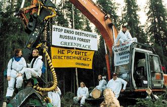 В конце августа активисты «Гринпис» из России, Финляндии, Германии, Дании и Австрии блокировали работу финских лесорубов компании «Энсо», проводивших лесозаготовки в Карелии. 20 экологов выскочили из леса и на глазах у опешивших финнов приковали себя цепями и наручниками к работающим лесопильным машинам. Рабочим пришлось заглушить технику до 18 часов — официального окончания рабочего дня. Цепи и наручники должны не только приостановить уничтожение леса, но и приковать внимание к проблеме сохранения последних в Европе лесов, не тронутых хозяйственной деятельностью.