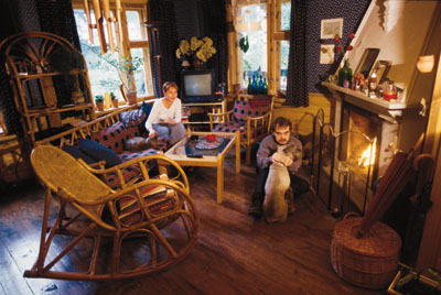 ...В кухне на стене висит картина, двойной портрет: он и она. Мне показалось, что в изображенных персонажах есть сходство с хозяином и хозяйкой дома. Про себя подумала, что, наверное, несколько лет назад художник Адабашьян так увидел себя и жену. На самом деле все оказалось гораздо прозаичнее — Катя нашла этот портрет на пустыре неподалеку от дома, когда гуляла с собакой. Подобрала. Принесла домой. Повесила. Мужу картина поначалу категорически не понравилась. «Ничего, со временем привык, — замечает она. — Саша ко многим вещам вначале относится очень категорично. Ему трудно согласиться на какие-то перемены, трудно изменить то, к чему он привык. И это в любом деле — от расстановки мебели до изменения моей прически. Он далеко не всегда бывает доволен результатом того, что делаю я. В итоге же получается, что на самом-то деле я все сделала именно так, как должно быть. Саша человек абсолютно творческий, и его, к примеру, не слишком волнует, во что он одет — в смокинг или джинсы. Главное, чтобы было удобно. Но вот уж чего действительно не переносит, так это неудобства в быту. Это не значит, что сам он гвоздь в стенку вбить не может, но бытовые «мелочи», будь то поломка автомобиля или какие-то прочие неурядицы, напрочь выбивают его из колеи».