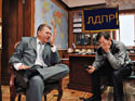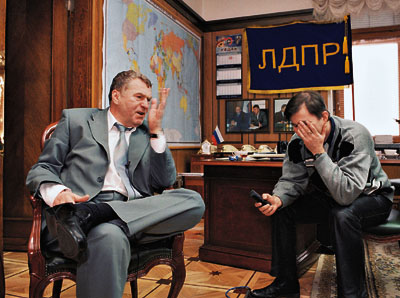 Я ошибся. Солнце светит! Выбрасывает протуберанцы! И спутники светила прекрасно об этом знают. Еще никогда мои интервью не проходили при таком стечении народа... Началось человек с четырех, а закончилось примерно дюжиной. Видимо, прослышав о представлении, зрители постепенно подтягивались в огромный кабинет Жириновского, рассаживались на задних рядах и внимали. На Жириновского была направлена партийная видеокамера, на его лацкане висел микрофон-«петличка». Вокруг суетился оператор.