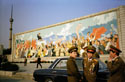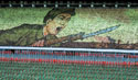 Лифт нас доставляет в Зал Плача, где мрамор будто усеян каплями слез, барельефы изображают корейский народ, терзаемый рыданиями, а посреди — широко смеющийся Вождь, обнаживший два ряда изумительно белых и ровных зубов. Это так называемый портрет Солнца. Старший вождь смотрит на вас в Пхеньяне отовсюду — начиная с крохотных изображений на значках, которые носят все северные корейцы, до огромного мозаичного панно на площади Ким Ир Сена.