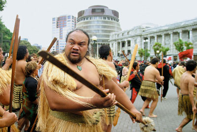 Новая Зеландия, Веллингтон. Этот человек не актер и не участник карнавала. В своих национальных одеждах и с древним оружием предков полинезийцы маори вышли на демонстрацию по поводу «плохого закона», который лишил племя, быть может, главного наследства — береговых земель. Теперь земля будет частная. Демонстрация получилась немаленькая, десятитысячная, да и повод, что говорить, серьезный. А город не ужаснулся. Белая цивилизация давно уже поглотила цивилизации маленькие. И все-таки жаль, что полинезийцам маори нельзя теперь гордо пройти по кромке океана и гордо сказать, вскинув руки: «Это моя земля! Это мой океан!»