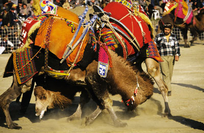Эти верблюды в отличие от своих сородичей действительно отличаются неукротимым боевым темпераментом. «Боевая порода», которую обычно называют здесь «тулу», выводилась специально, путем скрещивания двугорбых верблюдов бактрианской породы и одногорбых дромадеров.