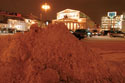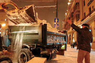 Из центра столицы, в том числе из Кремля, снег везут на Шлюзовую набережную, 10. Этот пункт на сленге рабочих называется «снегоплав», а с 18 января — начала небывалого выпадения осадков — «снегопот». Обычно снегоплав перерабатывает 9000 кубов снега в сутки, но теперь — 270 000 — 280 000. Процесс несложный. 90 КаМАЗов, МАЗов и ЗИЛов привозят снег, вываливают его в снегоприемный бункер. Сепаратор-дробилка (часть бункера) размалывает снег и мелкий мусор. Сор покрупнее — дорожные знаки, канализационные люки или канистры — выбрасывает бригада рабочих. Размягченный снег (на сленге — «шуга») уходит под землю на глубину 4 м, там в коллекторных каналах длиною в 30 м очищается от песка и плавится канализационными водами: ф-ш-ш-ш! Из-под земли поднимается пахучий туман. Расплав реагентами отправляется обратно в канализацию и течет к очистным сооружениям на окраину Москвы. Машины подъезжают к бункеру каждые две-три минуты. Процесс останавливается только на время часа пик, с 18 до 19 часов (грузовикам не пробиться через пробки), и на несколько часов ночью (в канализации по ночам не хватает воды: люди спят).
