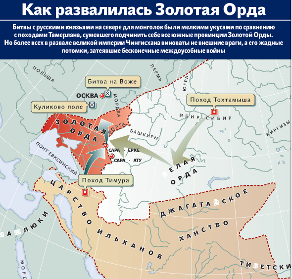 Тогда Мамай решил действовать в обход: женившись на дочери ханского царевича Бердибека, он организовал убийство его отца — хана Золотой Орды Джанибека. В 1357 году «отцеубийца» Бердибек был провозглашен ханом Золотой Орды, но всеми делами в государстве заправлял Мамай. Естественно, что далеко не все Чингисиды были этим довольны. В итоге Золотая Орда развалилась. Западные окраины — улусы — от Волги до Днепра — остались под властью Мамая, а восточными улусами стал управлять хан Мюрид.