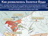 Взаимоотношения русских князей и ханов Золотой Орды более всего напоминали нынешний рэкет: хочешь жить — плати отступные бандитской «крыше». Татары, следуя простому принципу «разделяй и властвуй», старались перессорить меж собой русских князей, чтобы не допустить появления на Руси какого-либо объединяющего центра. Делалось это с помощью торговли ярлыками на великое княжение, которые давали право князьям самим собирать с русских земель дань для Золотой Орды (оставляя, понятное дело, себе немалый процент). Получая ярлык, князь заключал специальный договор, в котором обговаривался размер ежегодной дани. Естественно, каждый старался перещеголять конкурентов и предложить Орде как можно более выгодные условия. Да и татары строго следили, чтобы никто не мог надолго задержаться в должности великого князя. Например, в первой половине XIV века ярлык великого князя принадлежал хозяину Владимира, потом его передали князю суздальскому, за ним — тверскому. Каждый такой переход ярлыка от одного хозяина к другому сопровождался военными конфликтами, а высшим арбитром выступали татарские войска, которые за разрешение споров опять-таки получали дополнительные деньги. Естественно, что такая политика вела к полному разорению и истощению русских княжеств, которое спустя века назовут последствиями «монголотатарского ига».
