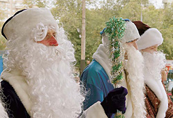 Одновременно в Москве прошел смотр Дедов Морозов. В отличие от консервативных британцев, наши деды стройны и без усов. Они носят кроссовки или сапоги, очки, обручальные кольца, удлиненные рукава. Самый авангардный, почти готический Мороз - байкер в черных кожаных штанах и перчатках с металлической защитой - приедет в Зеленоград. Он привезет с собой двух длинноногих Снегурочек в коротких юбках. Тюмень дождется тихого длинноволосого монголоида в красном атласном кимоно с меховыми лампасами. Вместо посоха и мешка у него будет с собой ротвейлер, «символ 2006 года». Главный Дед Мороз страны из Великого Устюга уже подготовил синее ватное пальто и расшитые бисером валенки.
