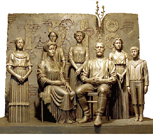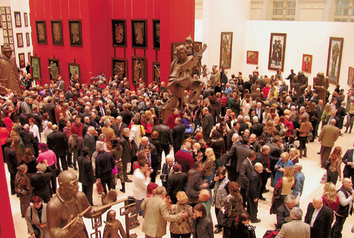 И надо сказать, что посмеяться над всем этим даже рука (а точнее, губа) не поднимается: озирая Манеж, целиком заставленный картинами, скульптурами, макетами, фресками и даже иконами работы одного-единственного автора, скорее благоговейно умолкаешь, отдавая должное трудолюбию скульптора. Нет, не бездельничал он, даже и водя дружбу с кем надо, и, будучи уже обласкан всеми, кем можно, не переставал трудиться. Большинство работ, выставленных в Манеже, датированы 2000 — 2006 годами. То есть это отчет о работе за последнюю пятилетку. Выставку Церетели лучше осматривать сверху, благо Манеж дает такую возможность. С балкона — и все целиком, сразу. И если и после этого вы скажете, что это называется не «многогранность таланта», а как-нибудь иначе, я не дам за вашу наблюдательность и ломаного гроша.