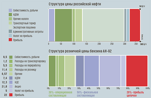 50 процентов структуры цены бензина АИ-95 — это налоговая составляющая. Если смотреть на структуру цены нефти на внутреннем рынке, то тут на налоги приходится уже около 70 процентов ее стоимости. Еще около 30 процентов цены — это операционная составляющая. То есть затраты на маркетинг, переработку, добычу, транспортные расходы.