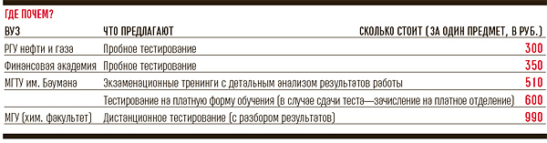 Однако пробные экзамены хороши не для всех. И особенно неудобны для будущих абитуриентов из других городов. Прибыльное решение проблемы нашли на химфаке МГУ. Здесь будущим студентам предлагают дистанционное тестирование: работы высылают по электронной почте и дают на их решение до 10 дней. Стоимость подобного тестирования — 990 рублей за предмет.