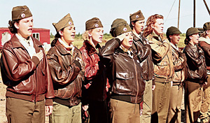Встречая американских пилотов, вроде бы классовых оппонентов, советские летчики затягивают «Интернационал». Но гости не обижаются, вероятно, в силу того, что с текстом революционного гимна не знакомы.