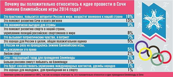 Оказывается, за то, чтобы зимняя Олимпиада 2014 года прошла в Сочи, выступают 67% россиян, а 74% одобряют то, что правительством будут выделены значительные средства на ее подготовку. В то, что Олимпиада-2014 станет нашей, верят 45% опрошенных, в победу австрийского Зальцбурга — 17%, а южнокорейского Пьончанга — 7%.