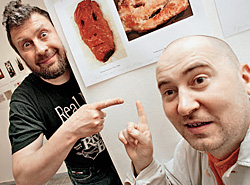 С тех пор повелось называть их «Синими носами». Состав группы с годами менялся, пока не сократился до двух человек — Вячеслава Мизина и Александра Шабурова (на фото). А художники продолжали творить. Идеями каждого нового проекта становились очередные клише массового сознания, культурные штампы, национальные стереотипы… То нам покажут бравых русских ребят в валенках и шапках-ушанках, угрожающих вилами гламурным девицам с плакатов («Реквизит для революций»), то силачей-культуристов на субботнике («Мода на труд»), то геометрические фигуры из колбасы и хлеба («Кухонный супрематизм»).