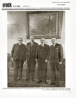 Ликвидированную Пруссию передали в состав РСФСР, что было накануне одобрено на Славянском конгрессе в Белграде: дело в том, что до немецкого завоевания в XII веке эта земля принадлежала славянским племенам. На обложке — после исторического заседания совета министров иностранных дел: г-н Э. Бевин (Великобритания), г-н Дж. Маршалл (США), В М. Молотов (СССР) и г-н Ж. Бидо (Франция). Сообщение о встрече министров заканчивалось на оптимистической ноте: «Рассеялся многовековой кошмар, конец Пруссии настал отныне и навеки!»