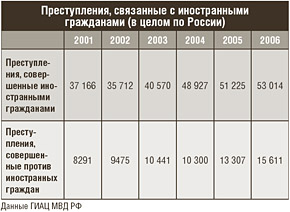 Каковы же причины разрастания ксенофобии, расизма и неонацизма? Убежден, что корни этого — в криминальном эхе межнациональных конфликтов времен распада СССР. Этим эхом пронизаны все гипермиграционные процессы. На сегодняшний день в России официально оформлено на работу 1 млн 150 тысяч мигрантов, большинство — из стран СНГ. Одновременно около 10 млн мигрантов, по данным МВД России, находятся в стране на нелегальном положении. Поэтому не приходится удивляться, что преступления, совершенные самими иностранцами в России с начала XXI века, возросли на 42,6 процента (с 37 тысяч в 2001 году до 53 тысяч в 2006 году), тогда как преступления против иностранцев — почти вдвое, на 88,2 процента (с 8 тысяч до 15,6 тысячи).