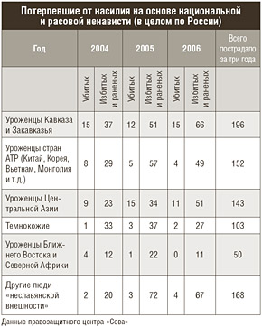 Официальная статистика о насилии над людьми на почве национальной и расовой ненависти далеко не полно отражает объективную ситуацию по понятным причинам: пока в суде не установлены преступники, в статистику не попадают мотивы их действий. Замеры насилия на основе национальной и расовой ненависти по специальным методикам ведут социологи. Так, по данным аналитиков правозащитного центра «Сова», за прошлый год от нападений на почве расовой ненависти в России пострадали 520 человек, 54 из которых убиты. С начала этого года из-за расистских преступлений погибли 30 человек, 193 получили ранения; эти цифры значительно превышают показатели аналогичного периода прошлого года. Нападения, за которыми, как правило, стоят скинхеды, в этом году произошли в 24 российских регионах. Лидирует Москва — в этом году здесь погиб 21 человек, 62 пострадали. В Санкт-Петербурге совершено три убийства, 56 человек пострадали. В Нижнем Новгороде получили ранения более 30 человек.