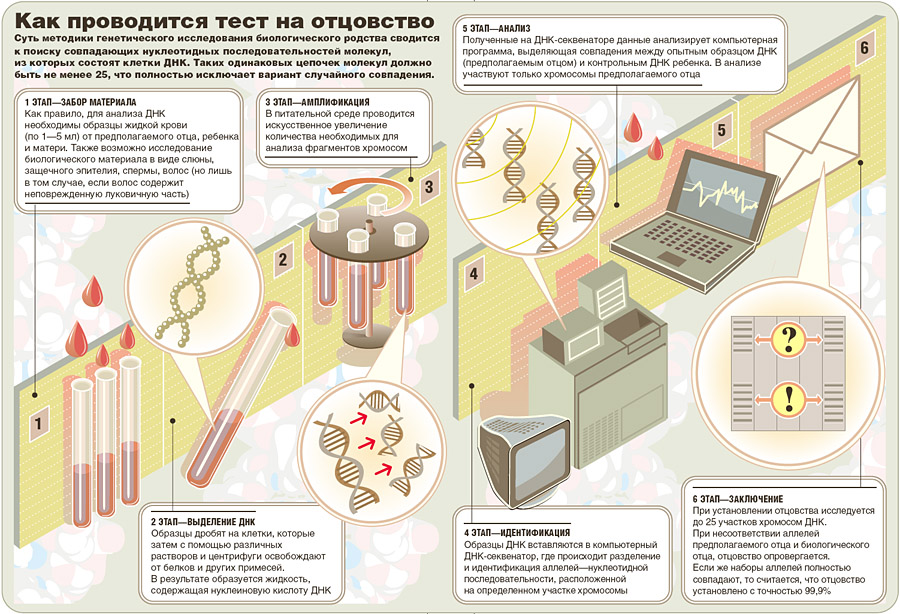 Но потом был открыт геном человека, а чуть позже появился и метод генетического «определения кровного родства». Это название сложилось исторически, поскольку изначально сам метод был придуман для совсем невеселых экспертиз — криминалистической идентификации останков или трупов людей. Потом его стали использовать для определения генетической предрасположенности к ряду онкологических заболеваний. А вот тесты на отцовство стали как бы побочным коммерческим продуктом, который с конца 80-х стала продвигать в массы англо-американская корпорация Cellmark Diagnostics, купившая патент на использование технологии геномной дактилоскопии. Реклама была обеспечена на самом высоком уровне — все таблоиды мира освещали, как поп-звезды типа Пола Маккартни и Эдди Мерфи с помощью ДНК-тестов отбивались от сумасшедших поклонниц, требовавших через суд признать звезд отцами своих детей. И Cellmark Diagnostics добилась своего — только в США ежегодно производится более 200 тысяч анализов ДНК на предмет установления отцовства. Недавно ДНК-тесты стали даже продаваться в ресторанах Нью-Йорка вместе с презервативами и тестами на определение беременности.