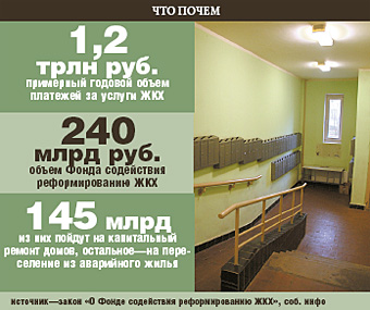 Еще один стимул — деньги Фонда содействия реформированию ЖКХ, он также заработает с 1 января будущего года. В распоряжении этой госкорпорации — 240 миллиардов рублей, которые должны быть потрачены до 2012 года. Из них 195 миллиардов пойдет на капитальный ремонт жилья. К ним по закону о Фонде должны добавиться миллиарды рублей из региональных бюджетов и от самих жильцов. Делать ремонт и осваивать эти деньги тоже будут управляющие организации.