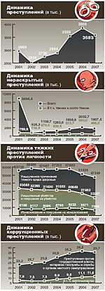 Самым негативным показателем официальной уголовной статистики за прошлый год является ухудшение показателей раскрываемости преступлений. В прошлом году осталось нераскрыто 1 миллион 807 тысяч преступлений. Если мы сравним показатели 2007 года с аналогичными данными за 2001 год, то картина станет удручающей: общее число нераскрытых преступлений выросло в два раза. Всего с начала XXI века в стране остаются нераскрытыми около 9 миллионов 400 тысяч преступлений (данный показатель рассчитан с учетом раскрываемых ежегодно преступлений прошлых лет), в том числе 3 миллиона 800 тысяч тяжких и особо тяжких преступлений.