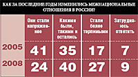 Россияне стали более терпимы к приезжим из других стран. Агрессивнее всего к мигрантам относятся в Северо-Западном федеральном округе (49% считают, что отношение стало более нетерпимым), менее всего — в Уральском (14%). При этом 68% опрошенных (особенно из Москвы и Санкт-Петербурга) плохо относятся к массовой иммиграции в Россию.