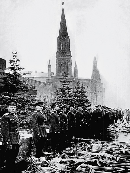 О Параде Победы 24 июня в № 27 «Огонька» за 1945 год рассказывалось на 2-й, 3-й и 4-й страницах: «В этот незабываемый день советский народ чествовал своих воинов-богатырей. Красная Армия послала на парад своих лучших сынов… Под глухую дробь барабанов 200 советских воинов проносят через площадь склоненные вражеские знамена и штандарты, захваченные в боях. Воины-победители бросают знамена поверженного врага к подножию Мавзолея». О чем же рассказывалось на 1-й странице «Огонька»? Там был помещен большой портрет Сталина и сообщение о присвоении ему звания Генералиссимуса Советского Союза, звания Героя Советского Союза и о награждении его вторым орденом «Победа».