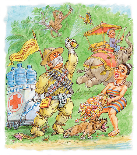 Российскому туристу за границей будет не до отдыха. Роспотребнадзор выпустил памятку для наших путешественников, при прочтении которой берет дрожь, кто бы мог подумать, насколько опасная это штука — отдых в чужих Палестинах. Туристам не рекомендуют есть местную еду и особенно пить туземный алкоголь. Врачи предостерегают от любых контактов с комарами, собаками, кошками и мертвыми птицами. Купаться можно только в бассейнах и «специальных водоемах», как написано в памятке. Упаси бог вас лежать на пляже без подстилки и ходить босиком. И только самоубийца отважится купить одежду или обувь из меха или кожи у частных торговцев. Если бы Роспотребнадзор так же строго контролировал российские места отдыха, может, наши туристы и не ехали бы отдыхать за границу?
