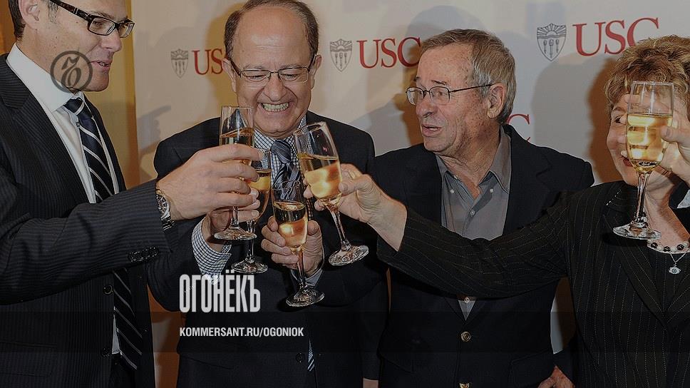 Один из лауреатов Нобелевской премии по химии — 2013 Арье Варшель (второй справа) принимает поздравления в Университете Южной Каролины, профессором которого он является