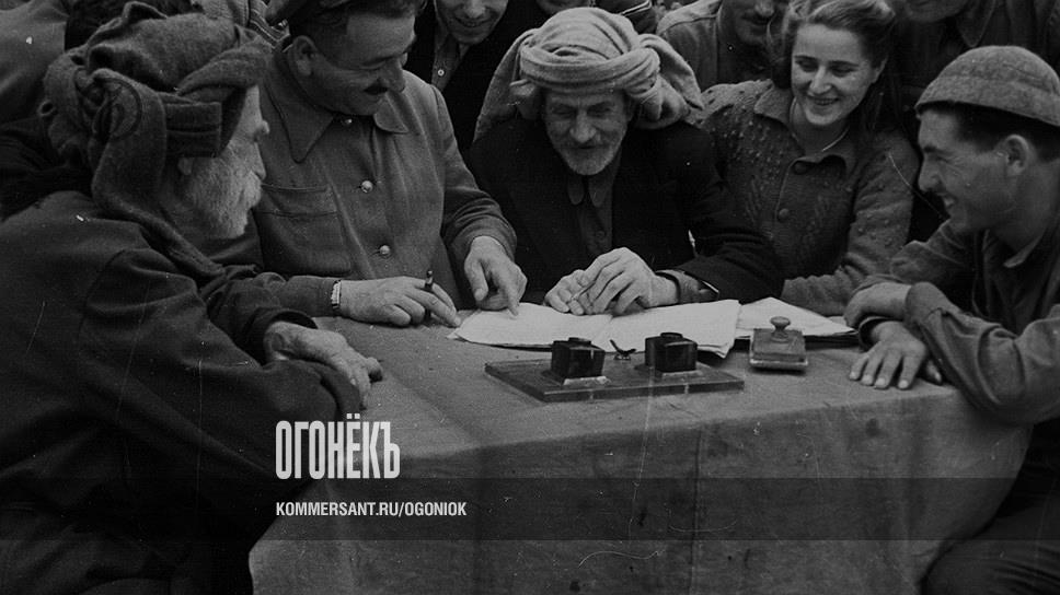 Дружили два колхоза. Грузинский, имени Орджоникидзе, и украинский, имени Сталина. Колхозники переписывались (за этим занятием застали их корреспонденты "Огонька" и сфотографировали), а также ездили друг к другу в гости (за этим не застали, поэтому описали словами). "И на украинское "Хай живе товарищ Сталин!" грузины восторженно кричали "Ваша!"",— писал "Огонек". А когда грузинский председатель колхоза поднимал рог: "Гомарджос великий Сталин!" — украинские колхозники отвечали: "Хай живе!"